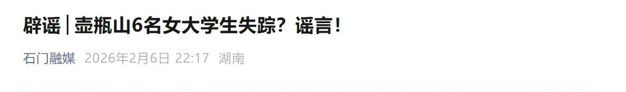 2月7日,湖南省常德市石门县融媒体中心示意,经核实,该视频为长沙某文化传媒有限公司节目组辩论的壶瓶山荒凉真东说念主秀节目剧情,6名女大学生失散系废话。石门县干系部门已照章对该公司认真东说念主进行警示约谈,责令下架废话视频。