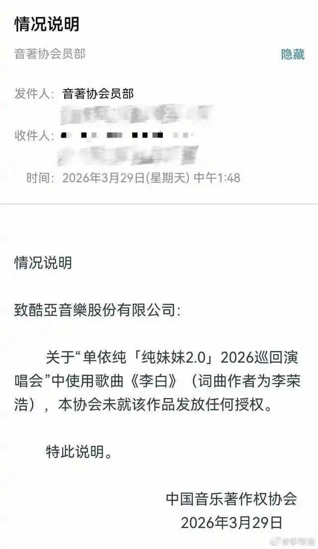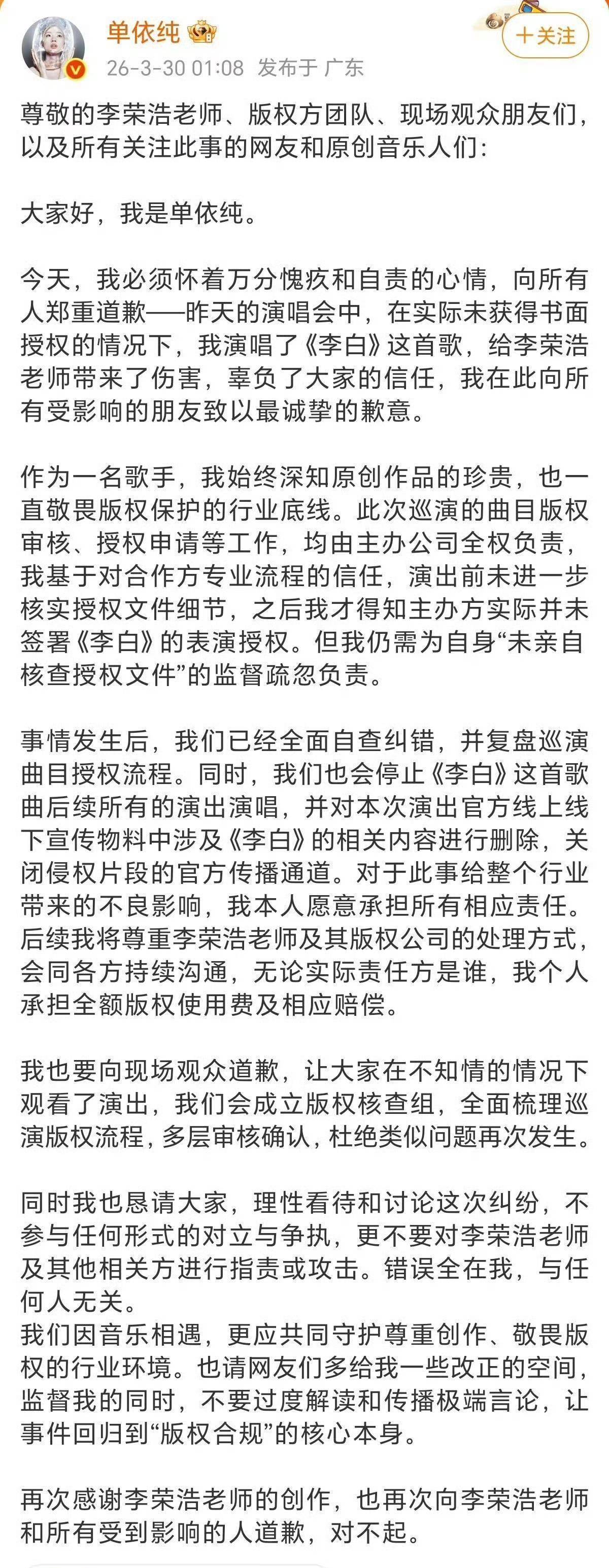 近日,歌手单依纯在巡回演唱会上演唱李荣浩创作的《李白》激励和顺。据悉,单依纯团队曾通过联系机构肯求该歌曲的营业上演授权,但在明确被拒却后仍进行了演唱。这一瞥为不仅遭到原创作曲东说念主李荣浩的公开质疑,也激励了行业对版权问题的平庸接头。事件发生后,单依纯方面发布说念歉声明,承认未得到授权便演唱的事实,并示意将承担相应包袱。